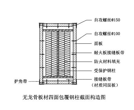 目前多采用條板,如纖維增強硅酸鈣板、石膏板、硅酸鹽防火板、涂裝板、包覆板以及各種復合板。條板厚度大多為5mm、6mm、8mm、9mm、10mm、12mm,寬度為609mm~610mm,長度2400mm~2440mm。安裝時,防火板下部先用一塊塊裁切好的小板材頂緊,然后用護角帶做護角處理,板縫用粘結砂漿或粘結劑進行粘結,并用膠泥刮縫,平整后再做表面處理。
